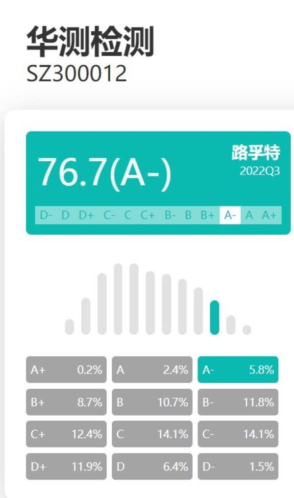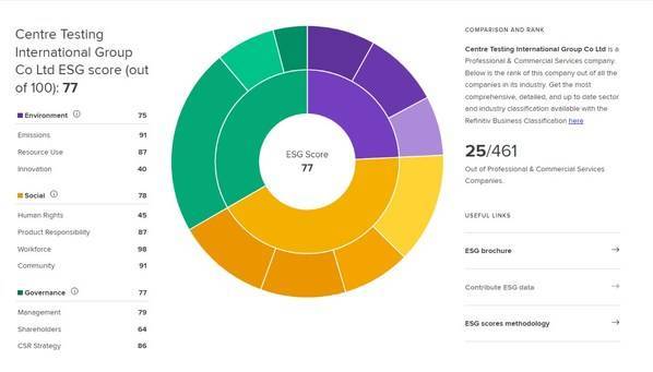 近日,CTI华测检测在路孚特(Refinitiv)ESG评级中获得77分,A-级,位居前8.4%,在全球受评估的461家专业服务业机构中位列前25名。在此范围内的分数表明CTI华测检测在公开报告重要ESG数据方面具有出色的相对ESG表现和高度透明度。