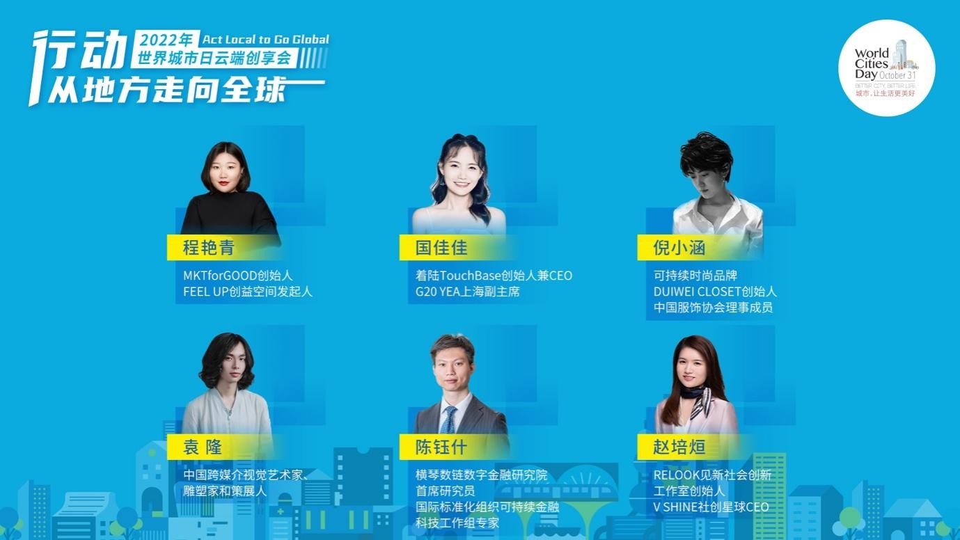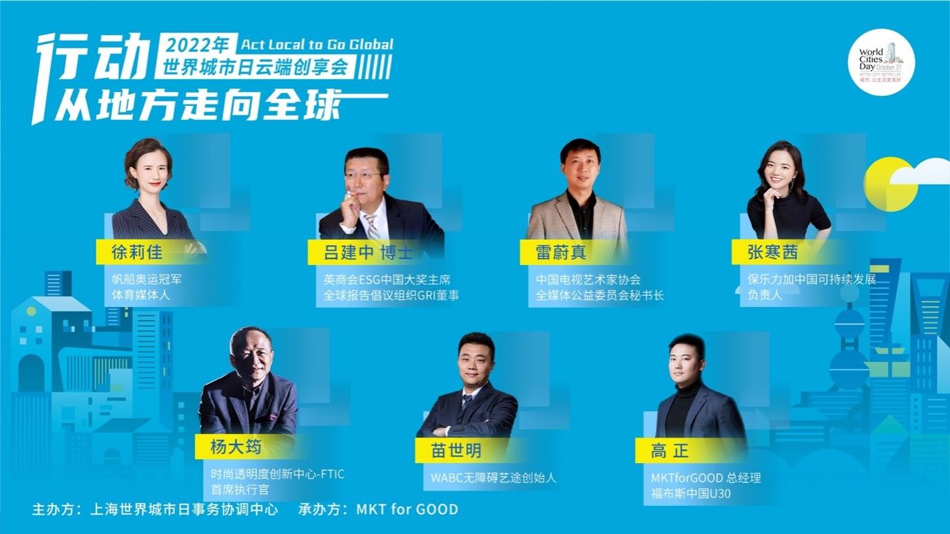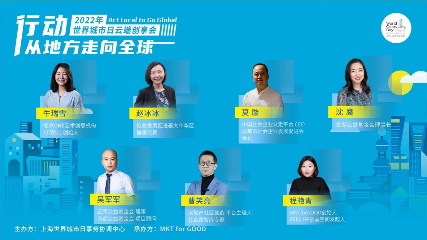 2022年世界城市日公益周围绕"Act Local to go Global"(行动,从地方走向全球)主题展开,上海世界城市日事务协调中心主办 MKTforGOOD 承办,顺利举办3场云端创享会,邀请近20位来自新媒体、时尚、艺术、公益、房产、体育及可持续金融等领域的的可持续推动者,展现社会各界推动可持续发展的优秀案例,以此动员社会组织、企业伙伴以及创新实践者,以本土化创新方式应对城市化过程中的各类问题,提高公众可持续发展的意识,推动全国城市可持续发展,呈现中国在可持续领域的国际影响力。