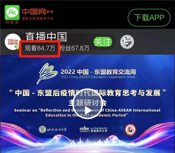 2022年12月3-4日,中国-东盟教育交流周“后疫情时代国际教育思考与发展”主题研讨会在泰国格乐大学成功举办。中国外交部、教育部、贵州省政府主办的中国-东盟教育交流周,是自2008年起为增进中国东盟彼此友谊、开展教育合作、加强区域间文化交流而举办的长期活动。此次主题研讨会属于2022中国-东盟教育交流周全年期活动,在中国教育国际交流协会、中国东盟国际教育协会(泰国)等单位的指导下,由泰国格乐大学、泰国-中国国际学校和北京语言大学联合主办,主会场设置在泰国格乐大学国际学术会议中心,同步开启了中国网+(央媒)、网易、新浪、抖音等国内外十余个主流媒体直播平台,面向全球使用泰语、中文、英语进行同步直播。来自中国、泰国、英国、俄罗斯、新加坡、柬埔寨、缅甸等国家的3000多名专家和学者,以及作为本次研讨会协办单位的中国百余家院校,通过直播平台全程参与了研讨会,会议期间累计观看实时直播的人数近300万人。