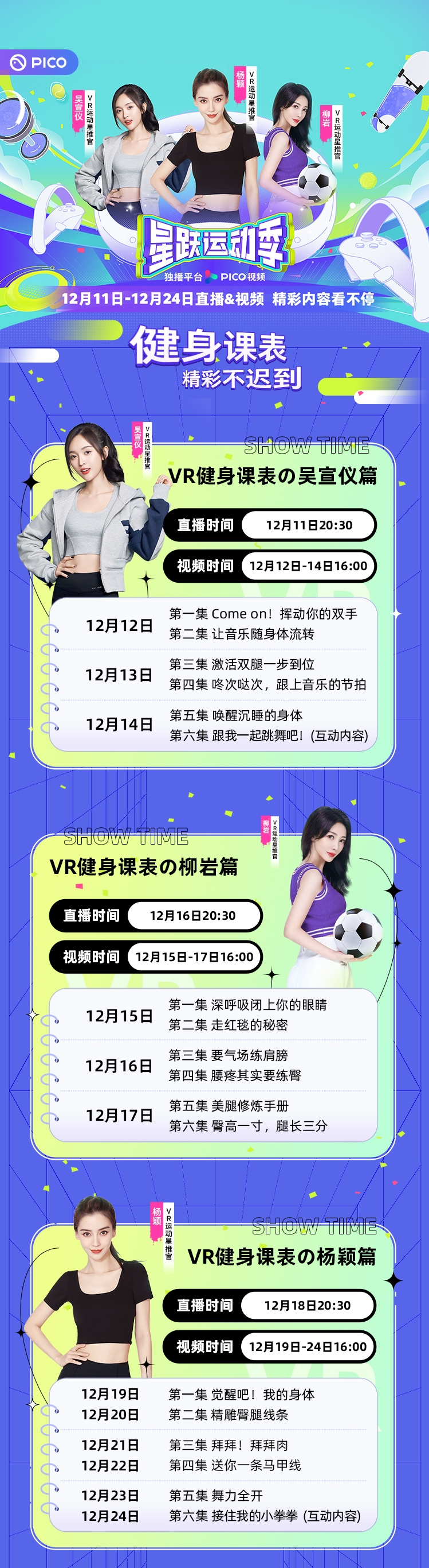 12月11日至12月24日,用户可以在PICO视频中开启VR健身课,体验明星近距离临场互动和陪伴的同时,随时随地享受互动健身的乐趣。