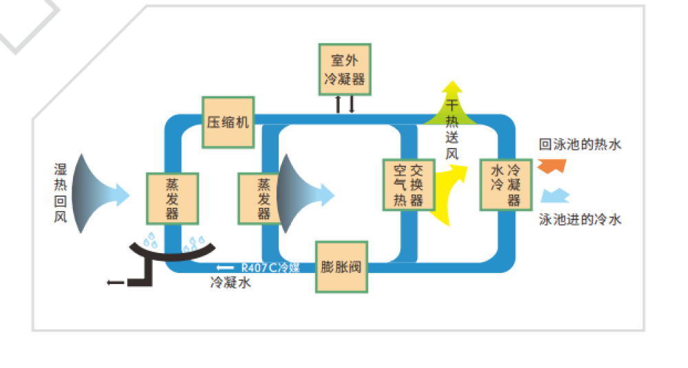 第二步:冷媒吸收的热能,首先经热交换器加热池水,实现池水加热功能;余热经空气冷凝器,加热冷却的室内空气,实现空气恒湿功能。