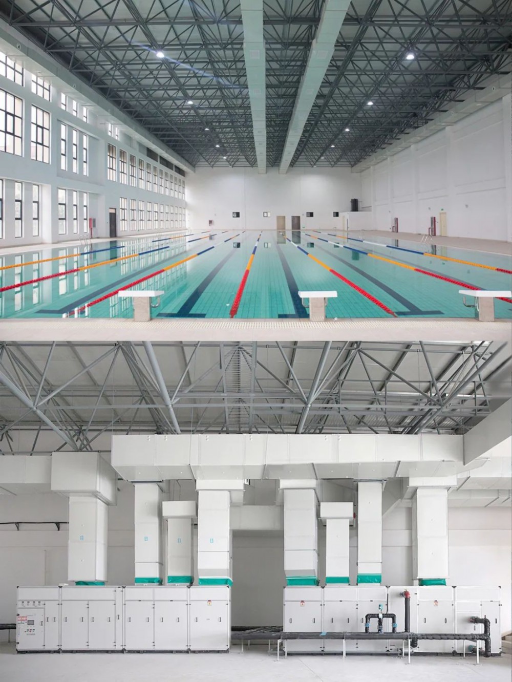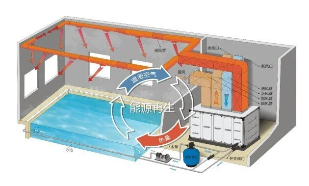 多功能除湿热泵集除湿、空气调节、热回收、池水加热、处理新风多项功能于一体。整合游泳馆的能量,以除湿热泵机组为纽带,构建一个池水——空气——初起时热——池水热量循环流动的闭合系统,让能量在这个环路中不断循环,多次被回收利用,从而整体降低游泳馆的运营成本,还带来舒适的泳池环境。