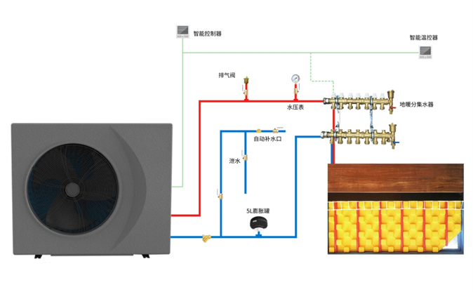 基于空气源热泵技术,地暖机依据逆卡诺循环原理,也就是将低品位热能转化为高品位热能同时消耗部分能量,高品位热能释放给进入热交换器中的冷水,冷水被加热到不高于60℃的温水,进入热循环系统。