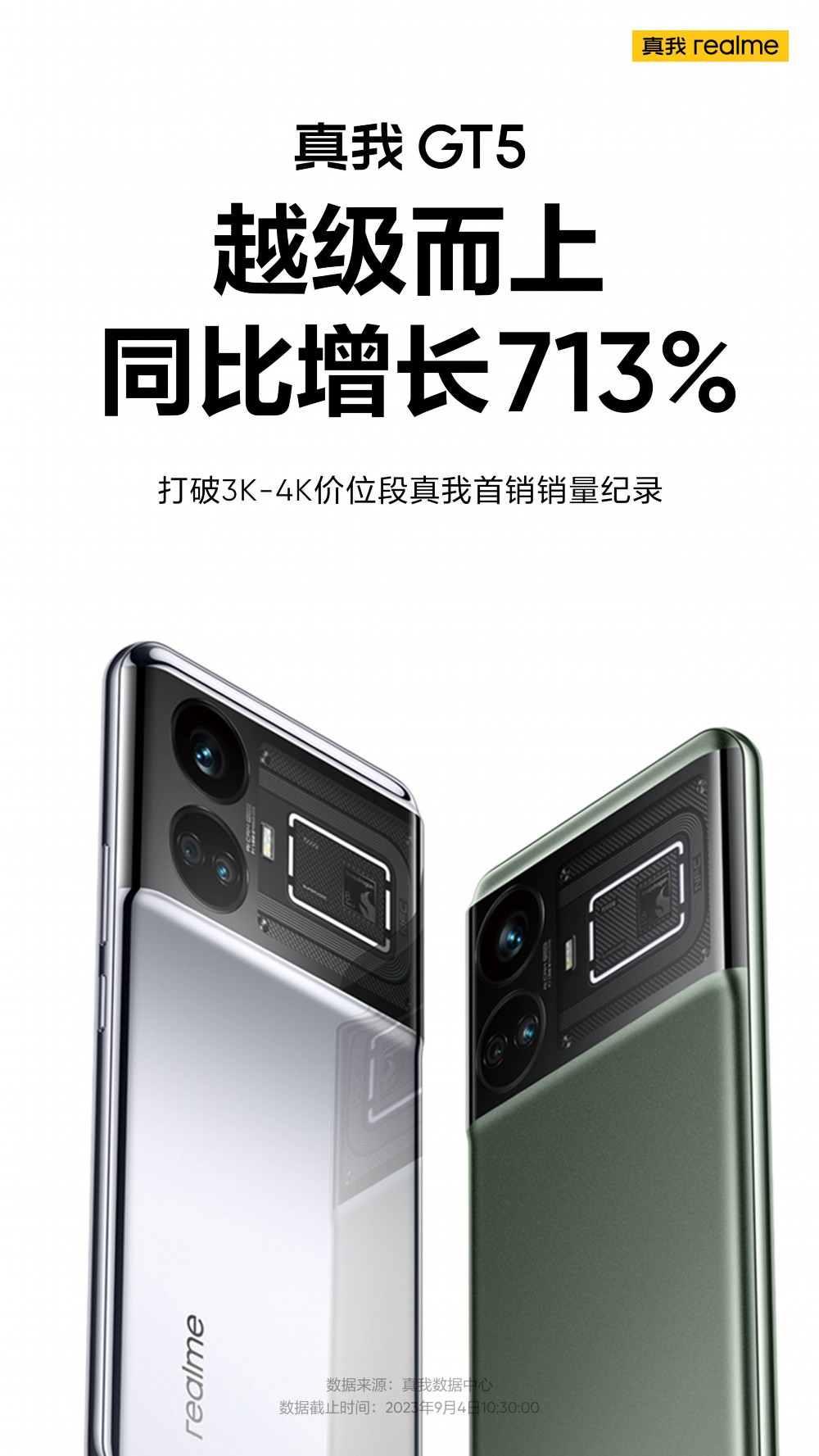 真我 GT系列作为代表真我「敢越级」理念的旗舰产品,也代表着品牌对性能最极致的追求,对设计有敢于探索的挑战,对科技有越级精神的坚持。真我 5周年之际,真我GT5的发布,为下一个五年的越级向上之旅标注全新起点。本次真我GT5打破真我3K-4K价位段首销纪录,实现销量同比713%高速增长的同时也为真我越级攀登计划的践行带来了开门红。真我GT5的爆款开局助力真我持续突破中高端,再一次验证真我深耕2K-4K价位段市场并向上突破4K+价位段,真我作为手机行业永远的变数拥有无限可能。