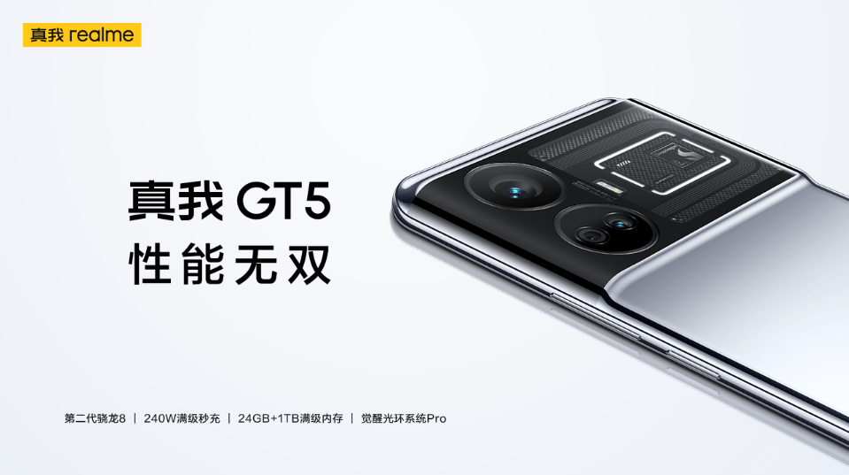 真我 GT5作为真我「五周年越级大作」,延续对极致性能的追求,为用户打造「性能无双」的旗舰体验。真我GT5搭载安卓最强旗舰芯第二代骁龙 8,至高 24GB+1TB满级内存,并且配备当下行业量产最强的长寿版240W满级秒充,将芯片、内存、闪充三维性能全面拉满,带来业内独此一家的性能超级组合,也是行业唯一240W直屏旗舰。此外,真我GT5还新增了150W+5240mAh的续航方案选择,支持 UFCS融合快充,挑战超百瓦闪充最强续航。