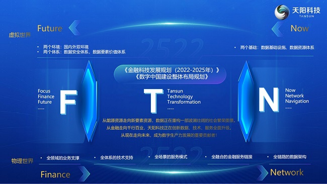 从金融走向千行百业,天阳科技在成立的20年里,服务超过300家金融客户,承建数万个金融IT系统,连续4年在赛迪顾问发布的《中国银行IT解决方案市场份额分析报告》中位居领导者象限。此次发布的“T+F+N”数据战略,天阳科技在《数字中国建设整体布局规划》的政策指导下,制定了“T+F+N”数据战略的“2522”的整体框架布局。旨在通过打造全领域的业务支撑、全体系的技术支持、全场景的服务模式、全融合的金融产业链接、全链路的数据架构五个图谱,创新推动数据、技术、服务的全面升级。面向未来,天阳科技携手合作伙伴在数据基础设施、数据资源体系两个基础优势上,构建行业领先的数据安全,数据要素价值两个体系,链接国内外双环境中数据的“产”“学”“研”“用”和“流通”的两个环境,致力于成为数字生产力发展的重要贡献者!