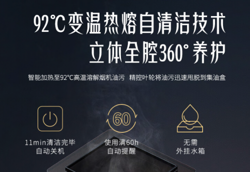 在清洁、除菌方面,海信DS11H抽油烟机也丝毫不含糊。92℃变温热熔的自清洁技术,高温消毒抑菌,实现立体全腔360°养护,无需外挂水箱,仅十一分钟即可将积攒的油污统统甩到集油盒,还您一个干净如新的抽油烟机!装配60小时智能检测功能,管家式清洁提醒,24小时待命,定期做出清洁提醒。另外,每次烹饪结束后,油烟机关机将自动进入养护程序,确保每次烹饪的油烟不残留、不过夜,确保您和家人的健康,护航厨房的每一次烹饪时刻。