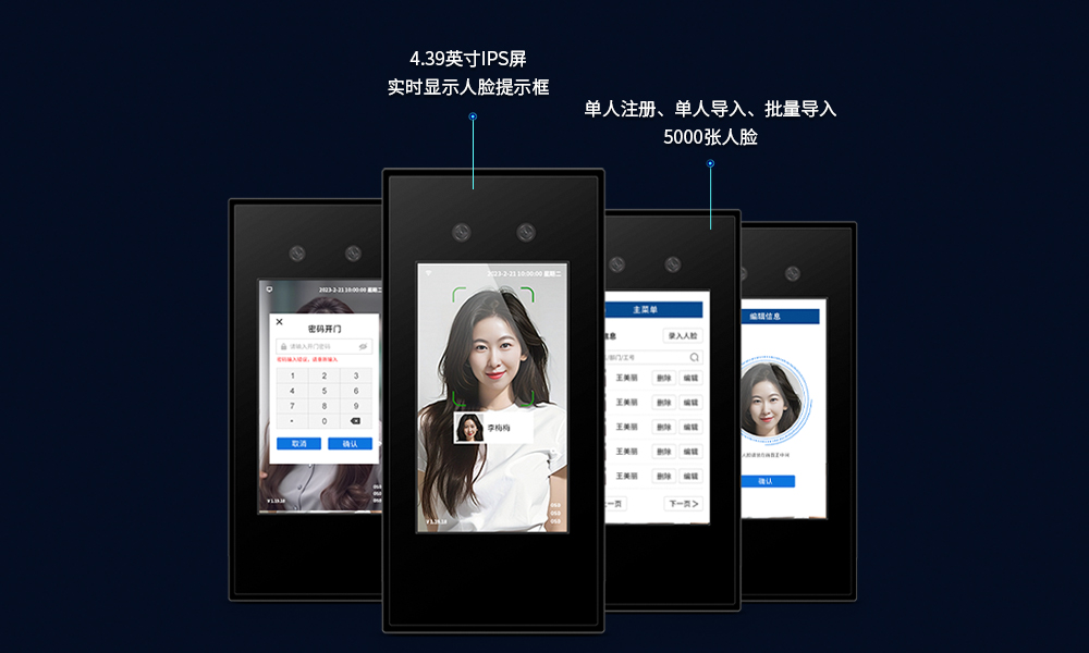设备同时采用IR+RGB双目摄像头,支持动态活体检测及多种遮挡识别,无论是面部表情变化还是佩戴眼镜、帽子等情况,都能准确识别出用户信息,完成智能动态人脸识别,极大地提升出入管理的效率,降低人力成本。