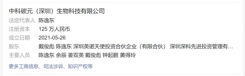 启信宝数据显示,中科碳元注册资本125万元,实缴资本30万元,(陈逸东称实缴资本为90万元资金以及中科院深圳先进院的知识产权),陈逸东、戴俊彪、中科院三方为原始股东。