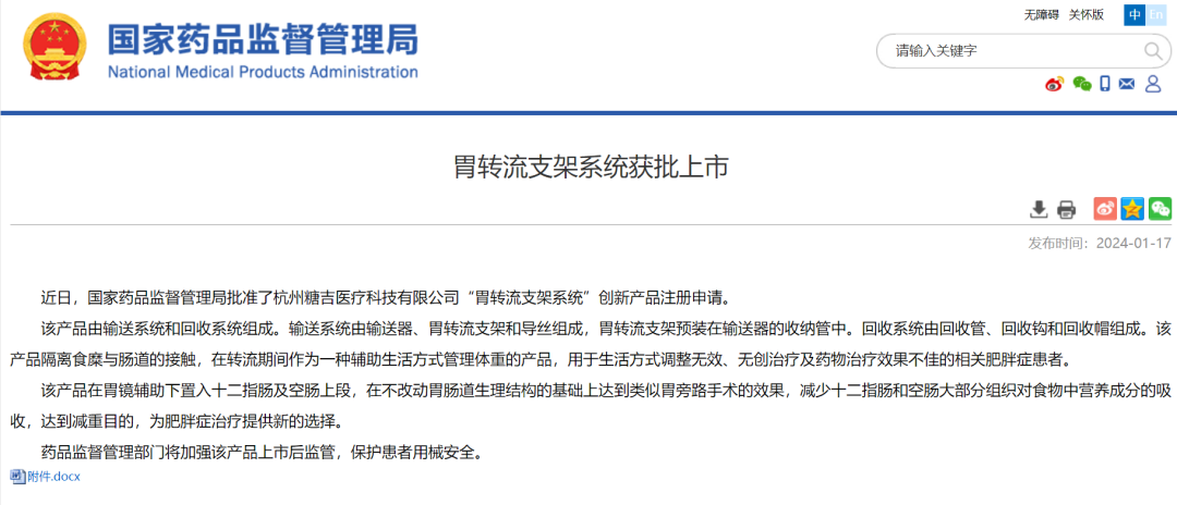 1月17日,杭州糖吉医疗科技有限公司的胃转流支架系统经国家药品监督管理局批准,获批全球首个肠道介入治疗肥胖症创新医疗器械三类证!