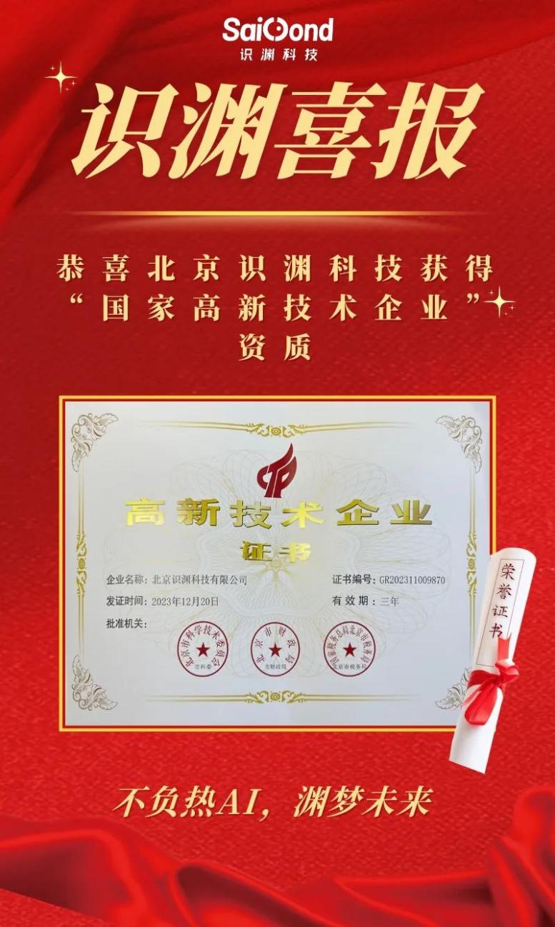 识渊科技顺利通过2023年“高新技术企业”认定,获得由北京市科技委、北京市财政局、国家税务总局北京市税务局联合颁发的高新技术企业证书,正式迈入国家高新技术企业行列。