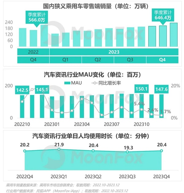 消费端的回暖也带来了汽车资讯需求的提升。近日,知名移动大数据服务商极光大数据发布的《2023年Q4移动互联网行业数据研究报告》(以下简称“报告”)显示,四季度汽车资讯行业活跃用户规模和人均使用时长同步上升。其中行业MAU在10月超过1.5亿,之后保持在1.4亿以上的稳定水平,较去年保持正增长态势;同期用户对汽车内容的获取需求有所提升,行业人均单日使用时长回升至20.4分钟,且较去年同期微量增长。
