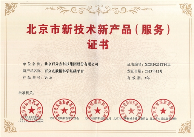 百分点数据科学基础平台经北京市科学技术委员会、北京市经济和信息化局等多部门联合认定,成功入选2023年北京市新技术新产品(服务)名录,并于近日获颁认证证书 。
