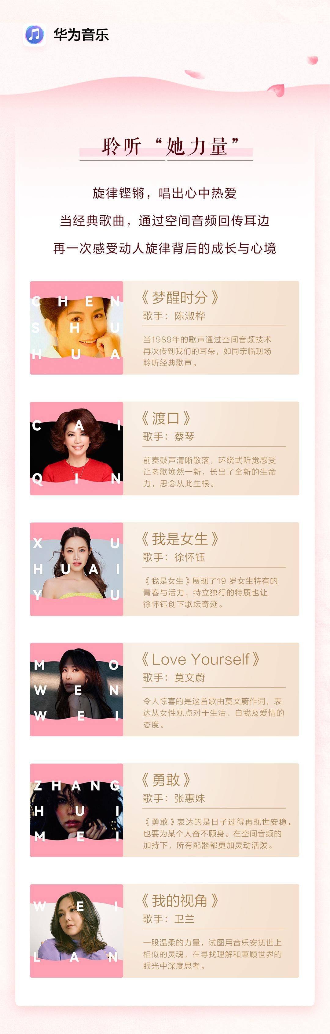 华为音乐专题内容,节选了不同年代的经典女性歌曲,同时还在华语乐坛众多女歌手中精选了六首极具代表的歌曲,包含经典永流传的陈淑桦《梦醒时分》;由莫文蔚亲自作词,表达从女性观点对于生活、自我及爱情的态度的《Love Yourself》;直面自己的脆弱,活出生活的本质的张惠妹《勇敢》等,都以全新空间音频歌曲形式推出。《勇敢》出自张惠妹2003年的专辑《勇敢》,张惠妹曾说过,在唱这首歌时,是自己最不勇敢的时候,正是音乐给了她力量,绽放她与生俱来的那股热情与生命力,通过歌声传递力量。