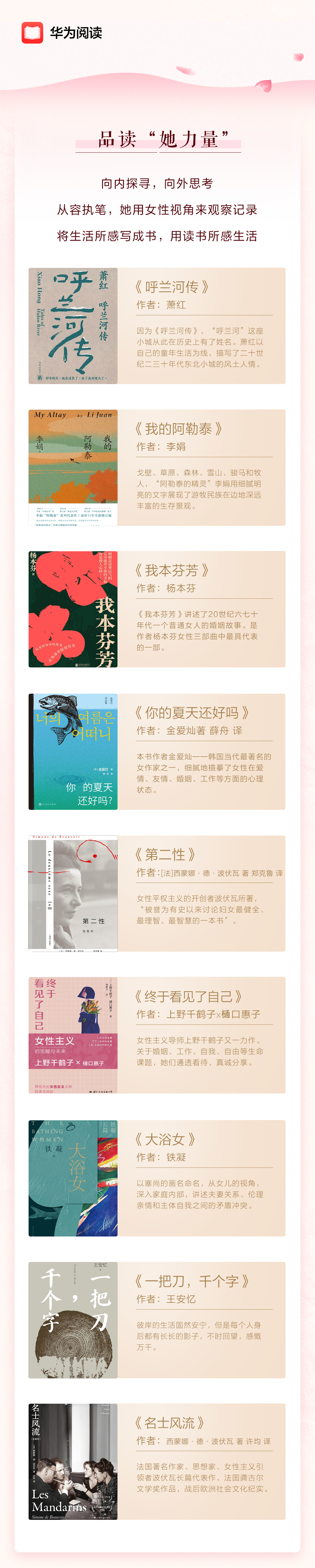 华为阅读精心挑选多部优秀作品,包含法国著名作家、思想家、女性主义引领者波伏瓦的长篇代表作《名士风流》、倡导女性平权的《第二性》。波伏瓦被称为女性平权主义的开创者,她以存在主义哲学为基础,开创性提出当代女性应从“第二性”中走出,与男性平等地建设社会和进行生活。该书也被誉为“有史以来讨论妇女的最健全、最理智、最充智慧的一本书”。铁凝的《玫瑰门》以其严谨而富有深度的笔触,揭示了女性在传统与现代、个人与家庭、情感与秩序之间的复杂矛盾关系,对女性在社会结构中的地位和价值进行了深刻而独到的思考。