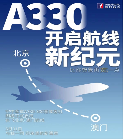 记者从澳门航空华北大区获悉,随着全国民航开始执行夏秋航季航班计划,自2024年3月31日起,澳门航空将正式启用A330宽体客机执行北京首都机场至澳门国际机场的部分航班。