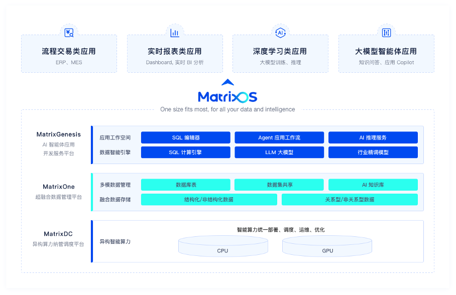 本轮融资将用于开发极简统一、开源开放的 AI-Native 数据智能全域操作系统 MatrixOS,该系统将由大规模异构算力纳管调度平台 MatrixDC、超融合异构数据管理平台 MatrixOne 和 AI智能体应用开发平台 MatrixGenesis 三部分组成,目标是打造链接算力、数据、知识、模型与企业应用的 AI Native 软件平台。