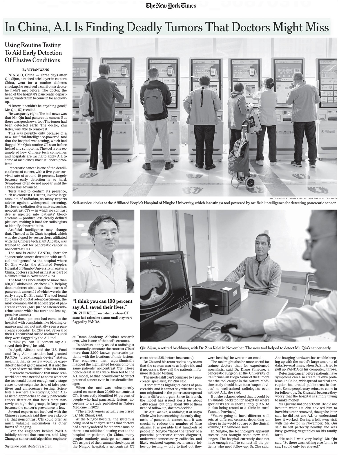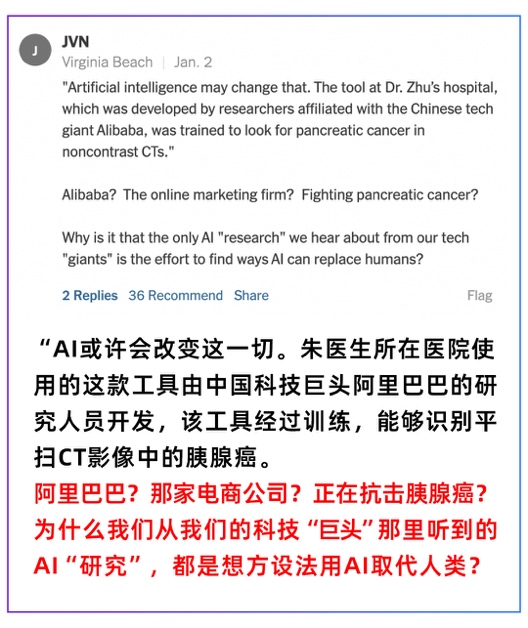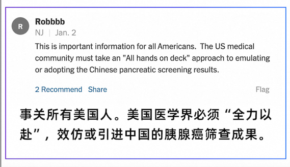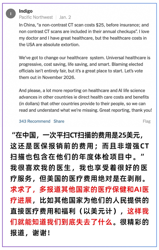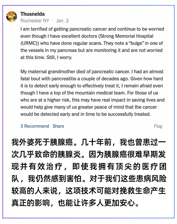 1月2日,《纽约时报》发布2026年首篇中国报道,题为《在中国,AI正在发现医生可能漏掉的致命肿瘤》(In China, A.I. Is Finding Deadly Tumors That Doctors Might Miss),整版讲述一个普通退休泥瓦匠的就医经历。凭借最新的中国AI技术,他仅花费了约25美元就查出了早期胰腺癌,令评论区里的美国网友集体“破防”,甚至有人感动得“热泪盈眶”。