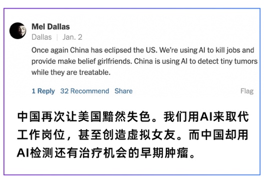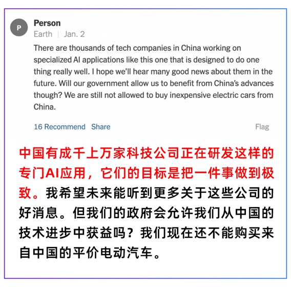 同一天,《纽约时报》还发表了一篇评论,题为《美国人为什么讨厌AI》。但在评论区,美国网友纷纷表达他们讨厌的可不是中国AI,中国AI是“一股清流”(a welcome change)。