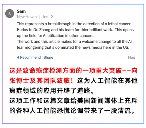 该院的朱柯磊医生对《纽约时报》说“我可以百分之百说,AI救了他们的命。”“他们都是因为肚子胀、恶心等症状来医院的,没有来看胰腺专科,CT片也没有显示异常,最后是AI报警了。”