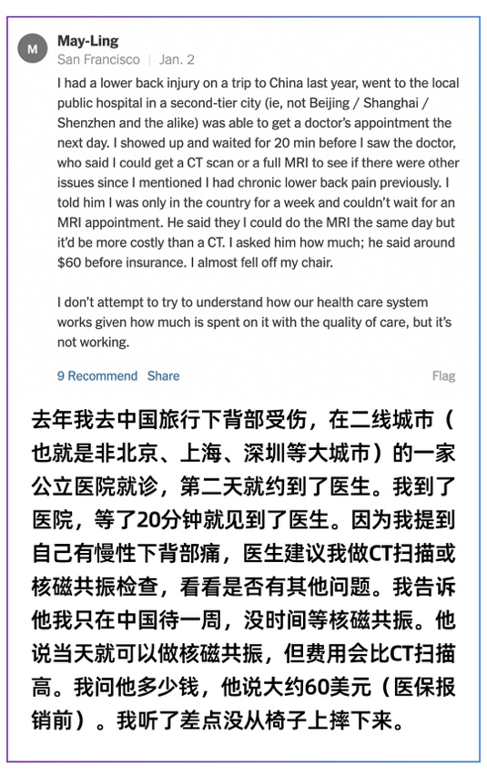 更有网友分享了在中国丝滑的就医经历,点赞“这才是为人民服务的医疗”。他一听说当场就能做核磁共振,还只要60美元,“差点从椅子上摔下来”。