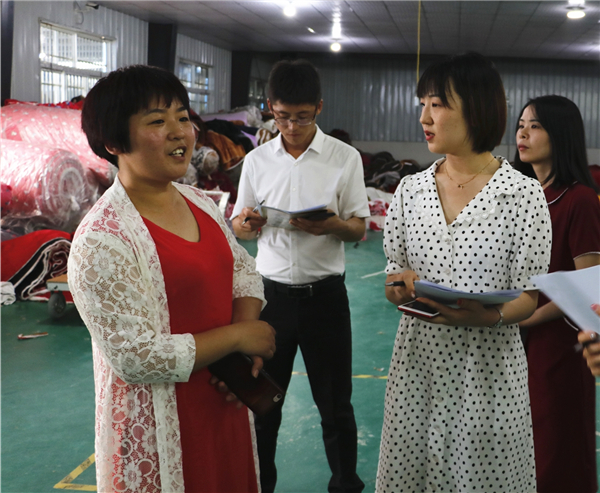 同样在太康县符草楼镇李庄村扶贫车间里,机器哒哒声不断,也是一派繁忙的景象。周艳娜是一名贫困户,因病致贫,家中有六口人,她是整个家庭的经济来源,自2018年扶贫车间建立以后,她便来到这里工作。