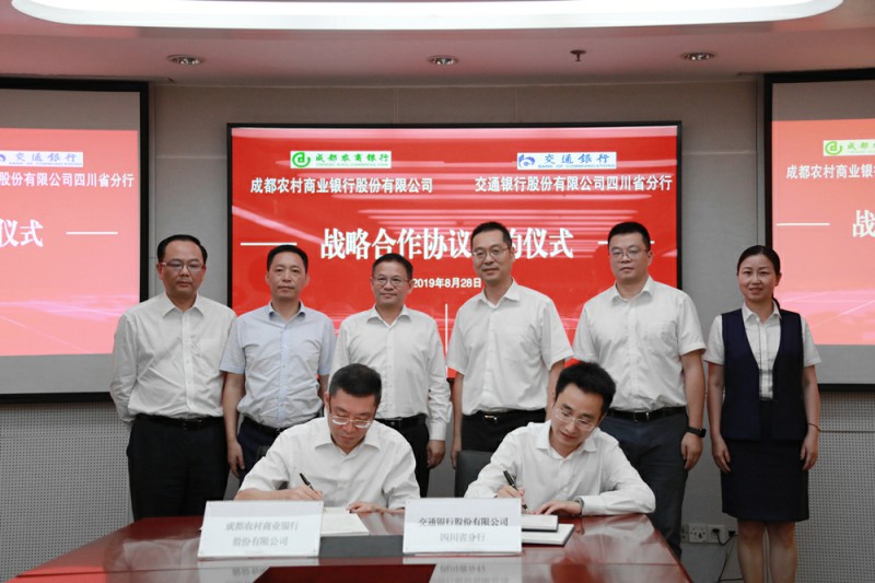 签约仪式上,成都农商银行副行长成先明和交通银行四川省分行副行长刘小差代表双方签约。