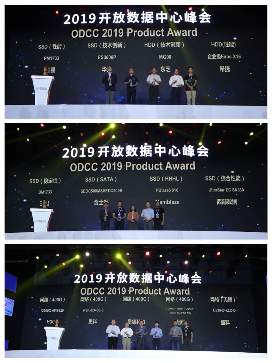 各大工作组的项目在如火如荼开展的过程中,也相应产生了很多优秀的数据中心产品,在ODCC联合实验室综合评估的基础上,三星、华为、金士顿、Memblaze、西部数据的相关固态硬盘产品;东芝、希捷的相关机械硬盘产品;华三、思科、旭创、是德科技的400G产品,以及盛科的无损网络产品获得2019优秀产品表彰。
