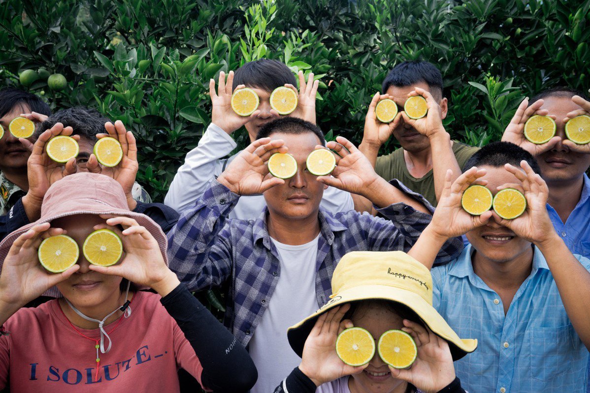 ▲龙陵基地工作人员手持“云冠橙”合影,预计40天后,云冠橙将彻底成熟。(摄影:阿良)