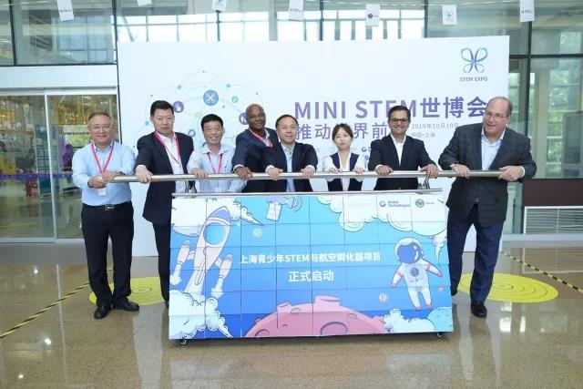 参加普惠上海发动机中心举办的“迷你STEM”世博会活动的与会嘉宾共同启动上海青少年STEM航空孵化器项目。左起:上海市航空学会秘书长金鸿明;中国东方航空股份有限公司副总经理冯亮;上海市航空学会常务理事、科普工作委员会主任、上海工程技术大学原副校长陈力华;普惠公司GTF发动机运营与工业管理副总裁罗伯特·格瑞菲斯(Robert Griffiths);联合技术公司亚太区政府关系高级副总裁谢丽平;中国友好和平发展基金会STEM 项目负责人李嘉莹;普惠公司商用发动机大中国区客户业务总裁范佑勋(Yogesh Farswani);普惠公司售后运营副总裁乔·斯维司特罗(Joe Sylvestro)
