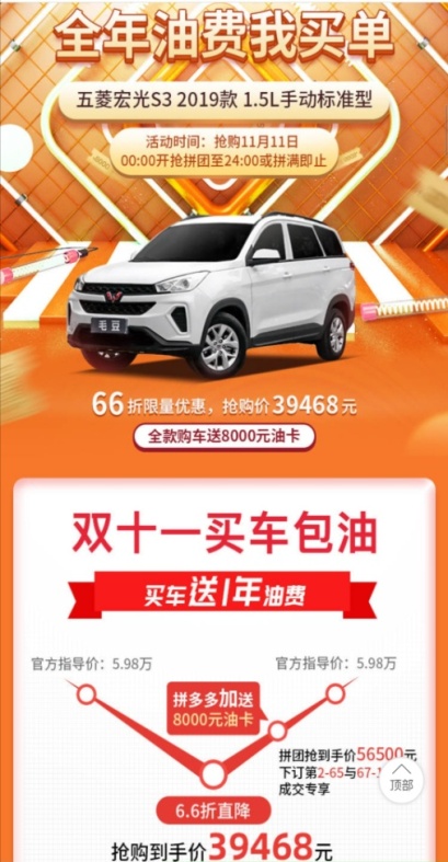 拼多多涉足整车销售业务后,表现出惊人的爆发力,曾创下了18秒卖出400辆五菱宏光、1分钟售罄387台奇瑞的业内记录。截至10月31日,拼多多整车销售订单高达11000笔。此次“买车包油”大促,有望实现至少2700辆的定金订单。
