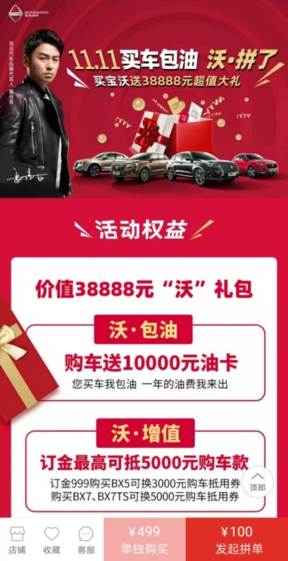 “你买车,我包油”,继创造“18秒卖出400辆国民神车”等奇迹后,今年双11,拼多多全网创新首推的整车销售活动重磅来袭。11日零点起,拼多多联合五菱宏光、上汽名爵、宝沃、观致、长安等5款“国民车型”,推出“买车包油”。消费者只要在规定时间内下单,在折扣价的基础上,还可以获得首年油费补贴。这是拼多多启动整车销售以来,回馈消费者的又一行业创举。