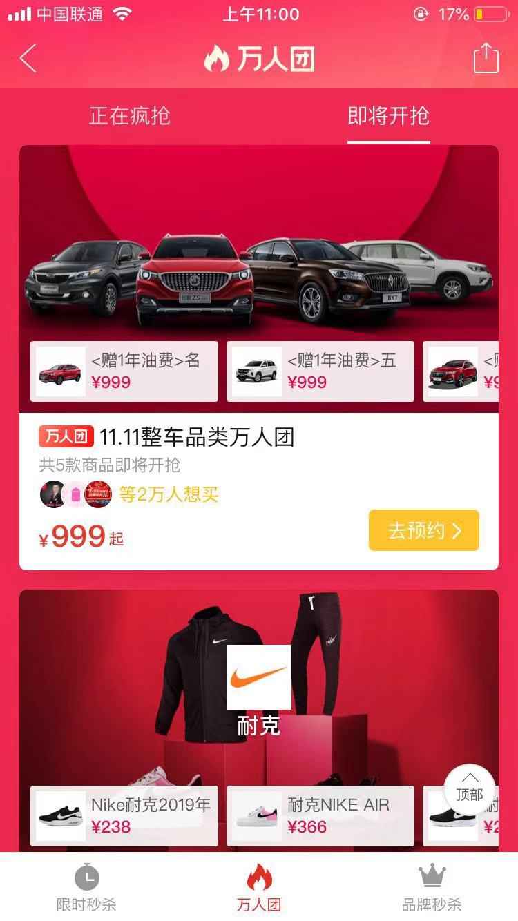 △通过“万人团”汇聚同类需求,集中体现了拼多多“人以群分”的逻辑。截至11月10日11点,预约人数已超20000人。