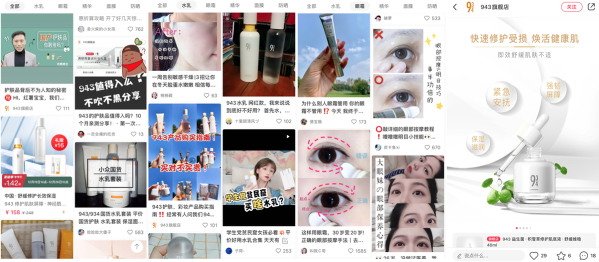 例如成立于2017年6月的广东新兴护肤品牌“943”,2018年4月正式进入小红书后,通过对用户反馈的分析,重新认识了消费群体中的”成分党“,经过调整保湿水乳的产品命名摆脱了产品打不开局面的形式,2019年2月春节期间,以成分新命名的“神经酰胺水乳”相关笔记中爆发了数篇互动破万的笔记,带动产品全网脱销。