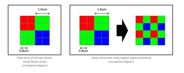 至于增加单个像素感光面积,IMX586通过Quad Bayer阵列和四合一像素聚合技术可实现等效1.6μm的单个像素感光面积,更高端的IMX600传感器可实现等效2.0μm的单个像素感光面积,虽然存在天花板,但也不失为一种解决方案,因此同样受到了不少手机厂商的青睐,例如华为P30系列。