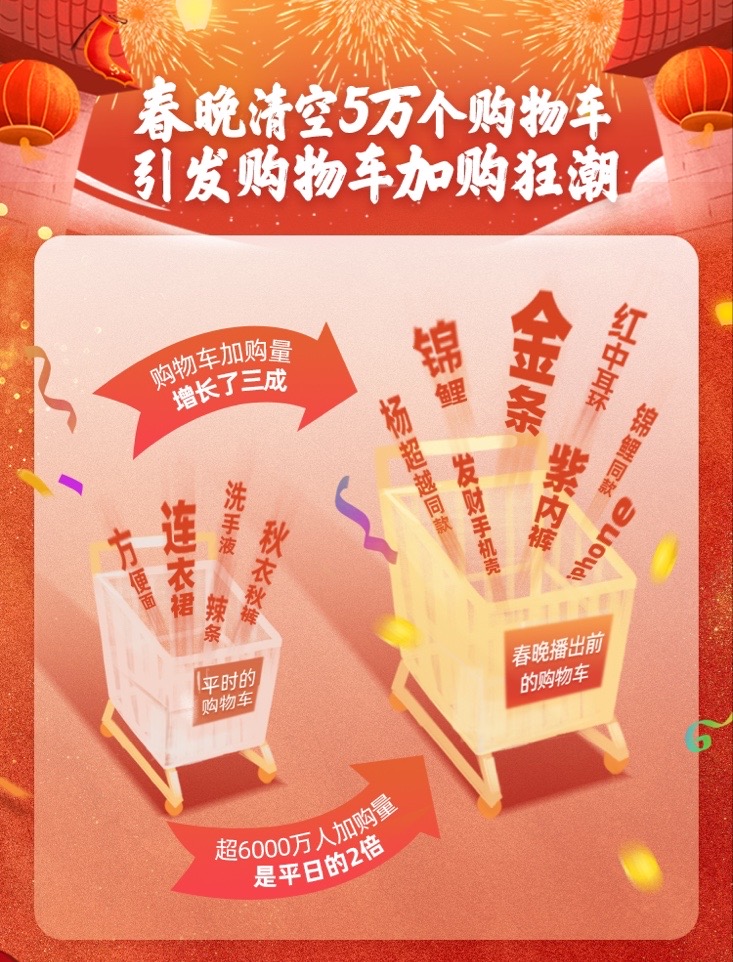 更有6000万人赶在春晚前在购物车里放了比去年多一倍的商品,等着春晚当天好运降临。