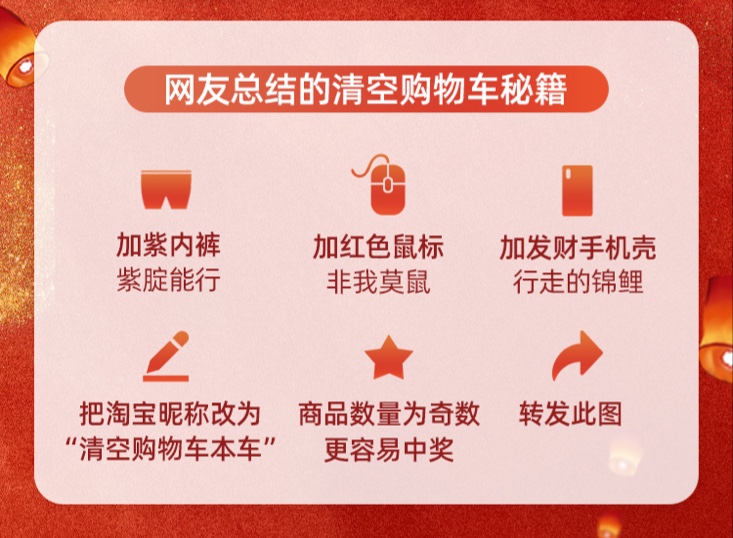 还有一些网友总结了“清空秘籍”,比如在购物车里加入“紫内裤”,寓意着“紫腚能行”,以此来提升“清空购物车”的中奖概率;还有放入“红色鼠标”,以示“非我莫属”,加购“发财手机壳”寓意“一夜发财”的……