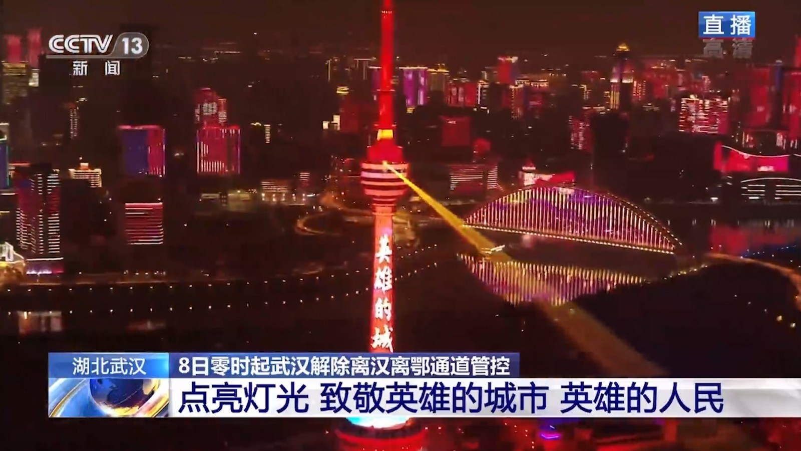 零时,汉阳关江汉关钟声响起。“英雄的城市,英雄的人民”大型灯光秀隆重开启。两江四岸,灯火璀璨。武汉这座英雄的城市,用壮丽的灯光秀迎接城市重启这一刻。
