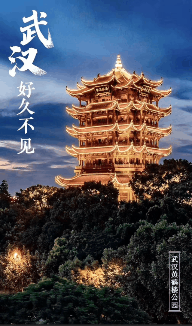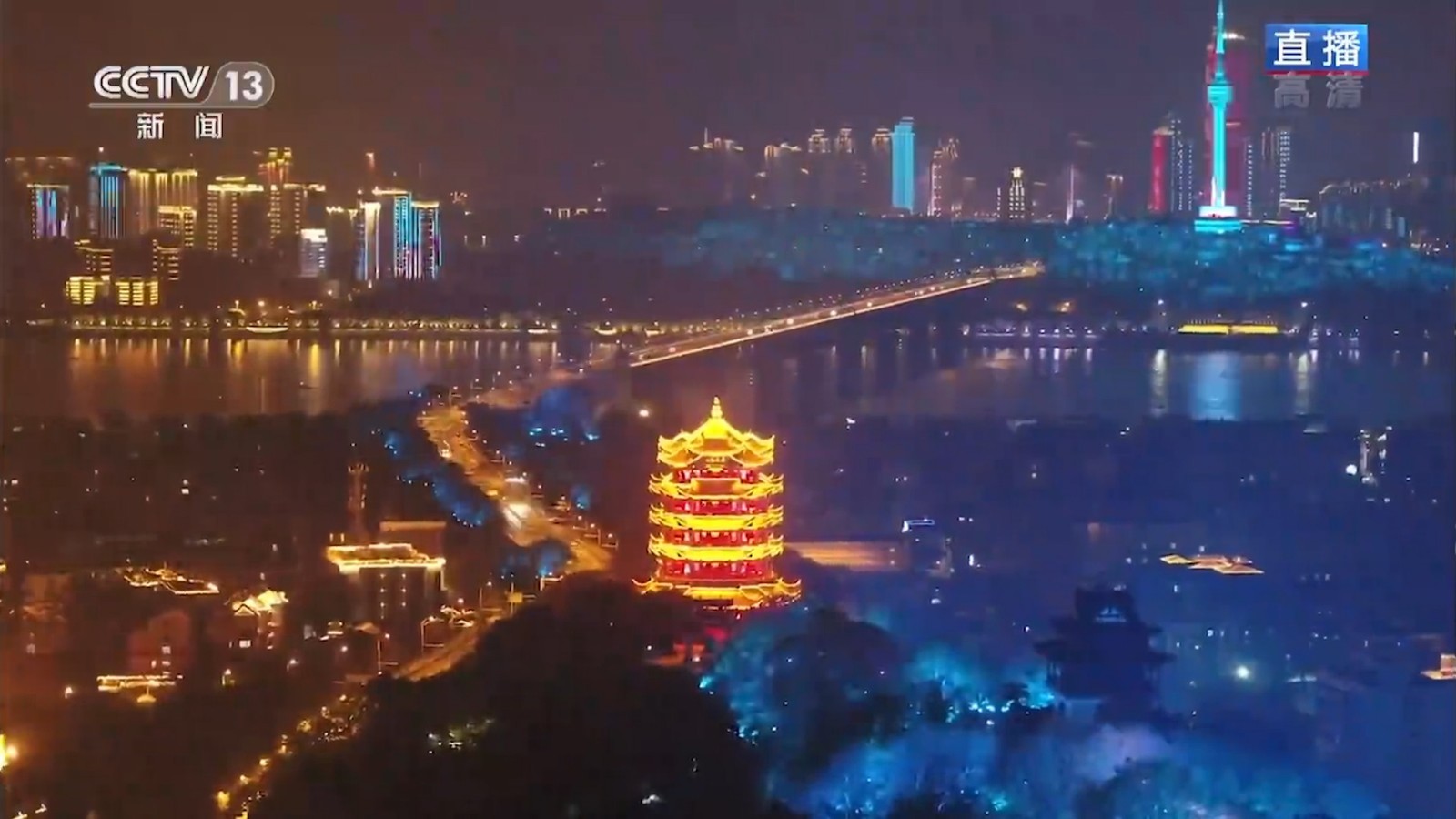 夜空中光影璀璨,矗立在龟山上的电视塔出现了“英雄的城市,英雄的人民”的灯光秀主题,与蛇山之巅武汉地标建筑黄鹤楼,遥相呼应。