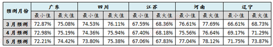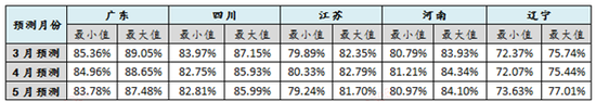 未来三个月趋势预测:伴随挂拍量的增长,预计成交率有进一步下行的趋势。以下为未来三个月前五省的成交率预测参考区间: