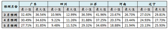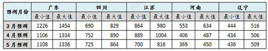 未来三个月趋势预测:随着复工复产的推进,各地的财产处置工作将逐渐恢复,预计各省的成交量将回升。以下为未来三个月前五省的成交量预测参考区间: