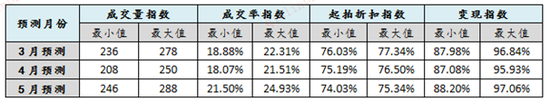 未来三个月趋势预测:预计未来土地投资的需求可能会进一步减弱,从2月份的拍卖数据来看,具备优势的好资产仍然会有市场空间,但这也表示市场竞争可能加大,土地的成交价格可能会有进一步下行的可能。以下为未来三个月土地的指数预测参考区间: