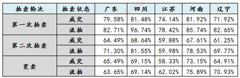 整体趋势分析:2月份前五省中,除了四川省的成交率下行外,其余省份均不同程度增长。广东省与辽宁省反弹幅度较大,由于挂拍量减少了20%,广东省成交率从1月的24%增至36%;而辽宁省的成交量较1月增长近一倍,挂拍量基本与1月相近,因此成交率从22.89%增长至37.84%,辽宁省的拍卖市场不仅未受到疫情影响,成交难度反而减小。