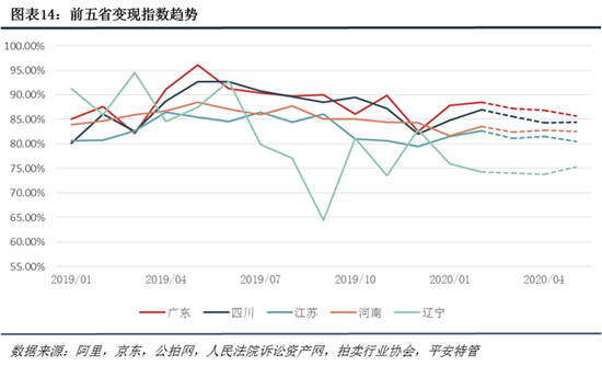 未来三个月趋势预测:随着疫情稳定,挂拍资产的急速增加,市场竞争加剧,各省变现系数仍有进一步下行的趋势。以下为未来三个月前五省的变现指数预测参考区间: