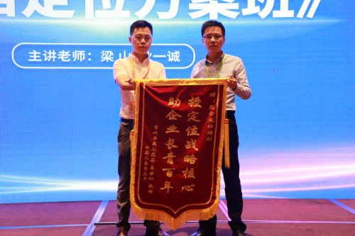 在课程接近尾声时,易宗仁将一面写有“授定位战略核心 助企业长青百年”的锦旗,递到昆仑定位CEO向光宁手中,以此表达对昆仑定位专家团队尽心辅导和服务的谢意。