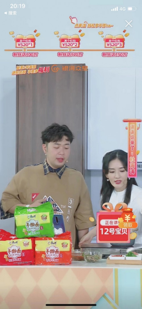 今年9月份康师傅旗下首个高端煮面系列“康师傅手擀面”先后与罗永浩及谢娜合作直播带货。在罗永浩的直播间,康师傅手擀面在10分钟内便售出了22万包。而在17日晚谢娜直播间中,康师傅手擀面在先后经历三次补货后依然卖到缺货,销量突破13万包。