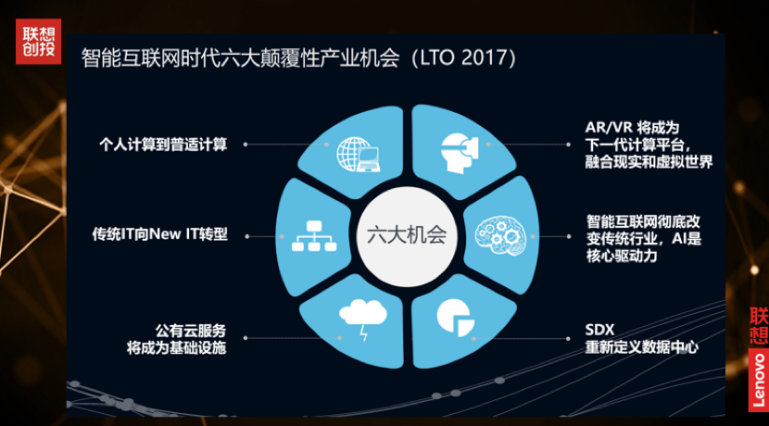 接下来我给大家讲一讲,联想创投做CVC的一些思考,每家CVC都有每家的打法,没有对错,只是一种选择。我特别感谢倪总在2016年联想创投成立的时候,就让我们在年度论坛上分享我们的一些思考,当时我还兼着联想集团CTO,讲了这张PPT,未来六大科技发展趋势。