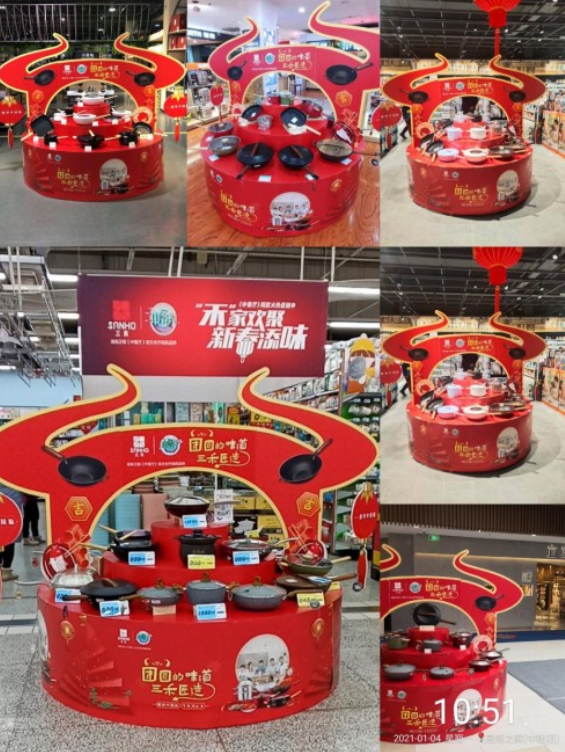 线下高端百货、商超渠道,三禾将在全国门店上新春节活动,并围绕春节活动对门店进行统一装饰,线下用户在活动期间,参与三禾锅具门店相关活动,即有机会赢得“三禾尊享礼”一份,同时门店还会在春节前后派送三禾春节牛年定制红包。