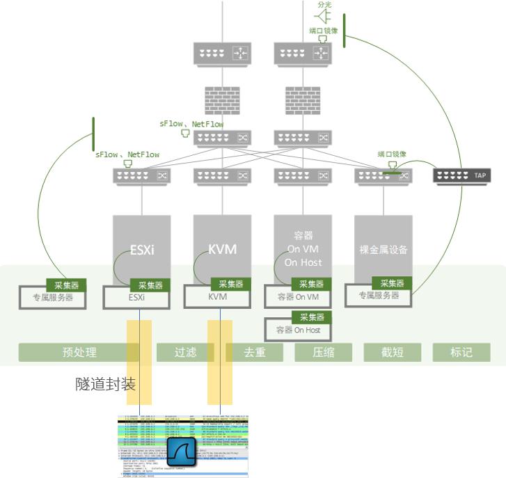 2016年起我们就开始了客户落地。当时,客户的诉求很直接,就是要看到虚拟网络中的流量,其中存在的挑战包括避免对生产环境的侵扰、保障性能的同时限制采集系统对资源的使用、能实现策略跟随以及支持隧道分发。客户的环境与现在还是有些区别,资源池类型主要是ESXi、XEN以及KVM,理念上也是关注全包。DeepFlow方案的重点就是采集与分发,为客户解决虚拟机间的东西向流量采集难题以及流量引出。需要做到避免侵扰数据面,在有限的资源使用下保障性能,在虚拟机发生迁移后,确保采集分发策略的统一及跟随。通过隧道封装,保时保序地将数据包分发至各类分析工具处。在这个阶段,DeepFlow实现了面向各类资源池的网络流量“采集处理抽象层”,统一提供采集、多维过滤、去重、压缩、截短等预处理功能。抽象层中的各类型采集器本身也是一套分布式系统,为后期面向大规模多类型的云环境监控中高性能数据处理提供基础保障。