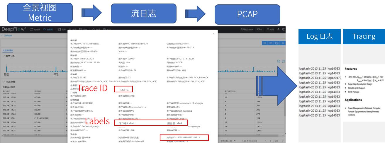 在目前阶段,云杉看到客户处容器环境发展迅猛,云建设思路更清晰,也更有规划。同时也在体系化地考虑监控保障侧的建设,将应用、网络及基础设施的Metric、Log、Tracing统一地加以规划整合。此时客户需求更多地面向业务侧、更注重随云扩展的架构实现、以及在此基础上提供高性能数据服务的能力。比较典型的一个方案就是支撑微服务平台的监控中心建设,通过DeepFlow各功能展现服务依赖关系、访问指标、网络性能等,基于网络流日志获取业务Trace ID、容器Labels等键值,关联Log平台和Tracing框架,完善分布式应用系统的可观测性。